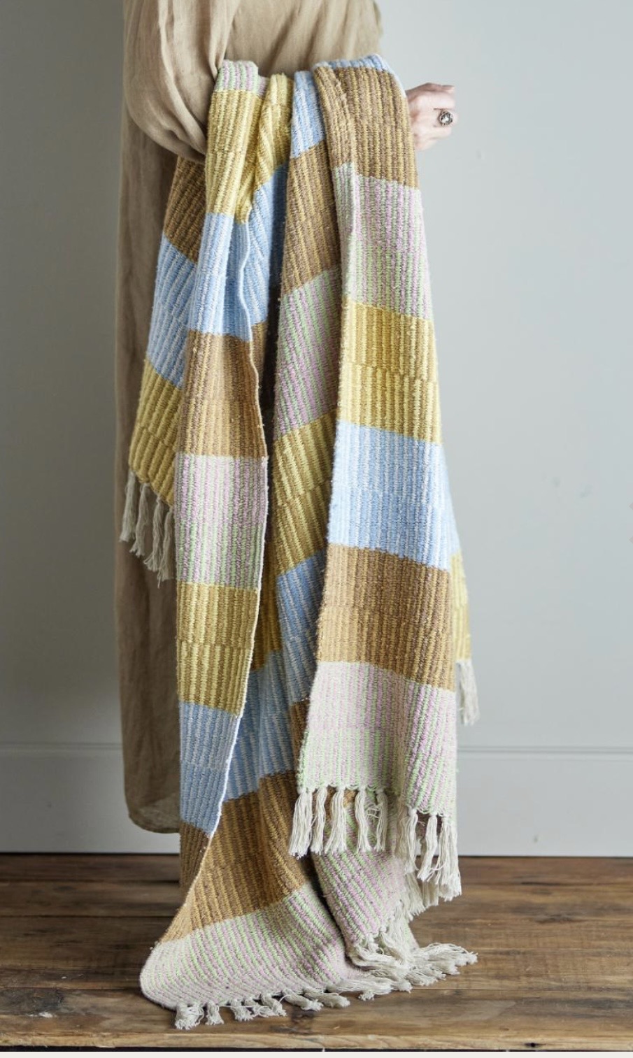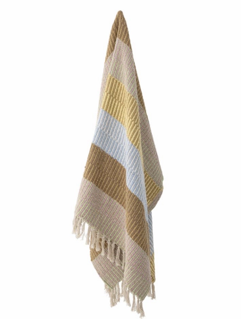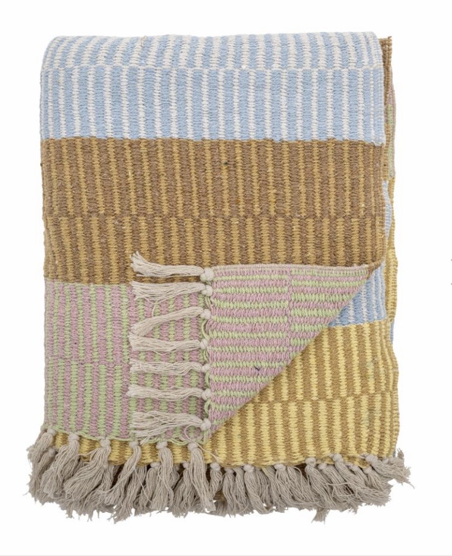 Isnel Plaiden fra Creative Collection er lavet af genanvendt bomuld med skønne striber i nuancer af lyseblå, beige, brun og gul. Den hyggelige plaid har frynser i begge ender.